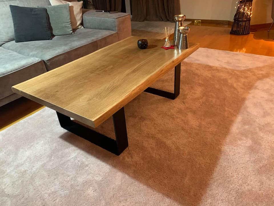 Κατασκευή coffe table από κορμό ξύλου δρυός και πόδια από μασίφ λάμα σιδήρου 100Χ10mm.